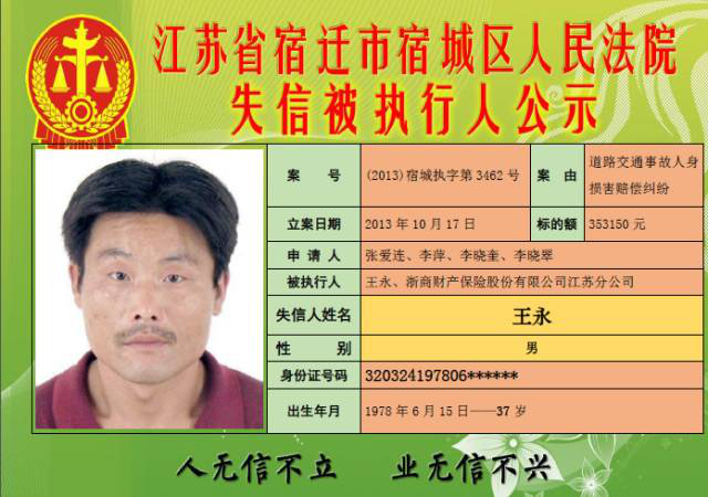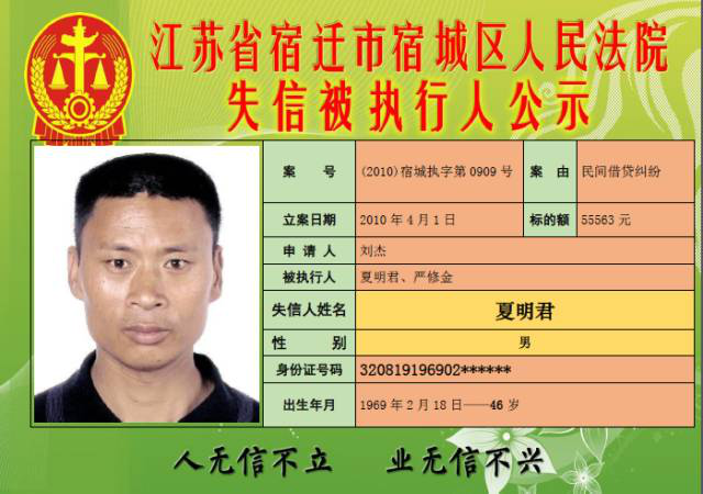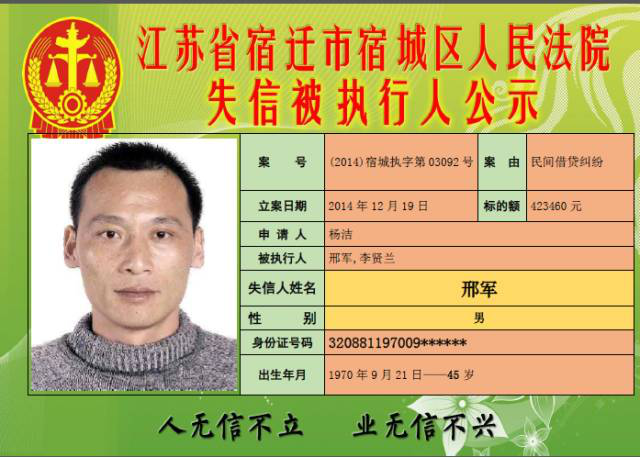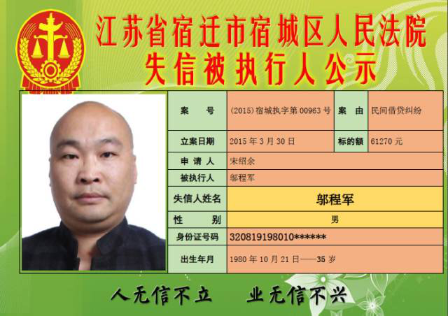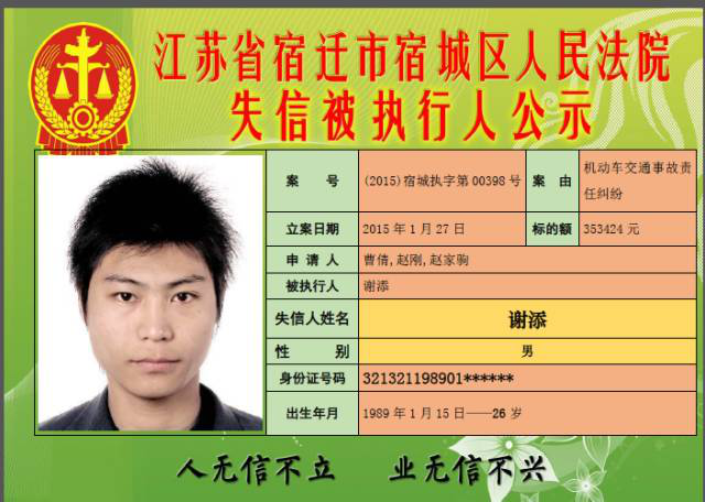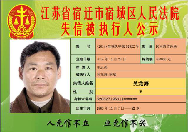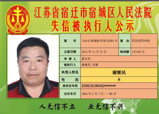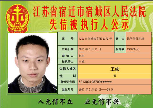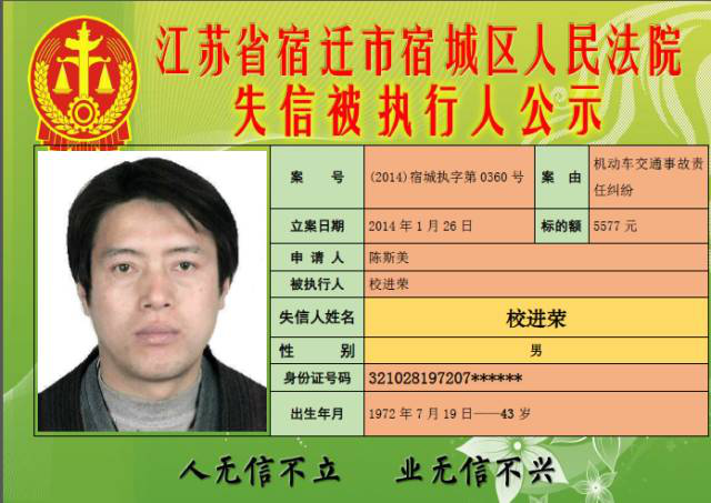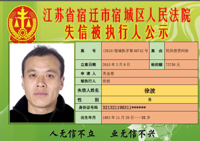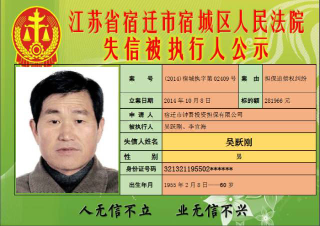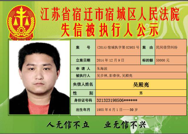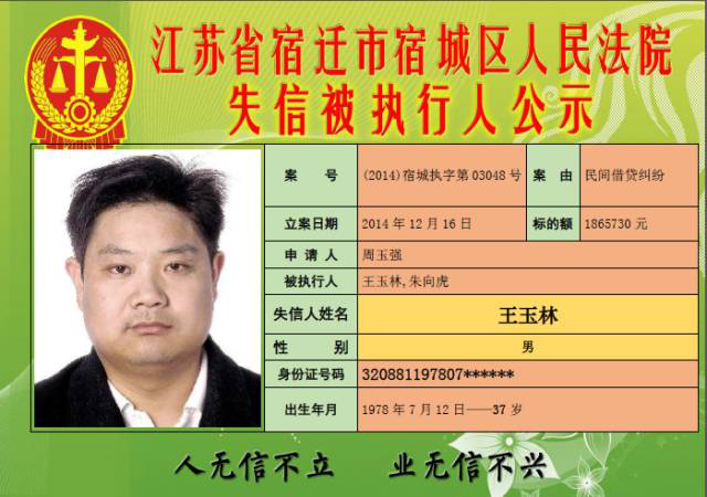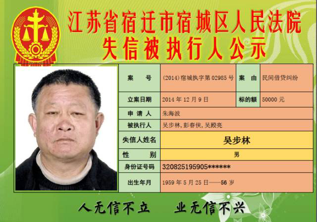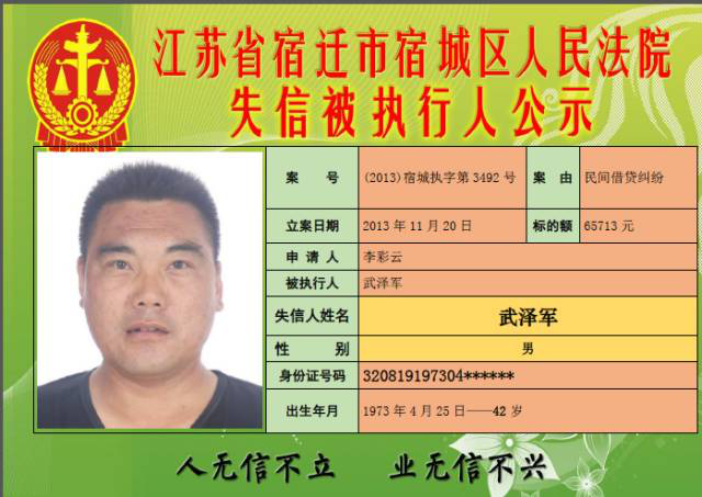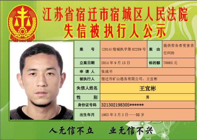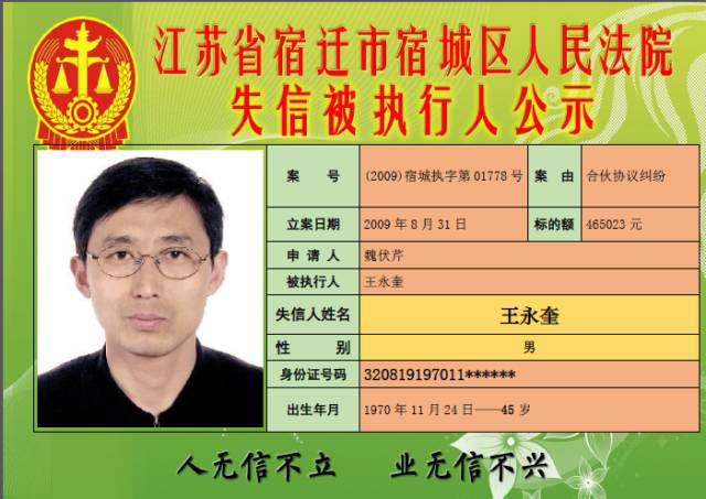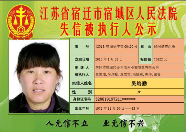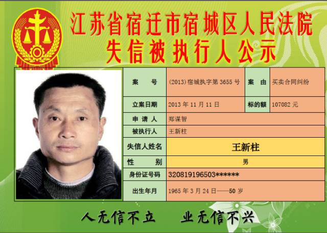 為切實(shí)保護(hù)當(dāng)事人合法權(quán)益,維護(hù)法律尊嚴(yán),服務(wù)地方經(jīng)濟(jì)和社會發(fā)展大局,宿城區(qū)人民法院決定將下列未自覺履行生效法律文書確定義務(wù)的被執(zhí)行人予以曝光,以督促被曝光的被執(zhí)行人及時(shí)履行法律文書確定的義務(wù)。歡迎廣大網(wǎng)友積極提供失信被執(zhí)行人財(cái)產(chǎn)線索、高消費(fèi)線索,可通過微信公眾號留言。