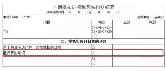 申報表填寫《增值稅納稅申報表附列資料(二)》(本期進項稅額明細(xì))第8欄“其他”,及《本期抵扣進項稅額結(jié)構(gòu)明細(xì)表》第30行“通行費的進項”。